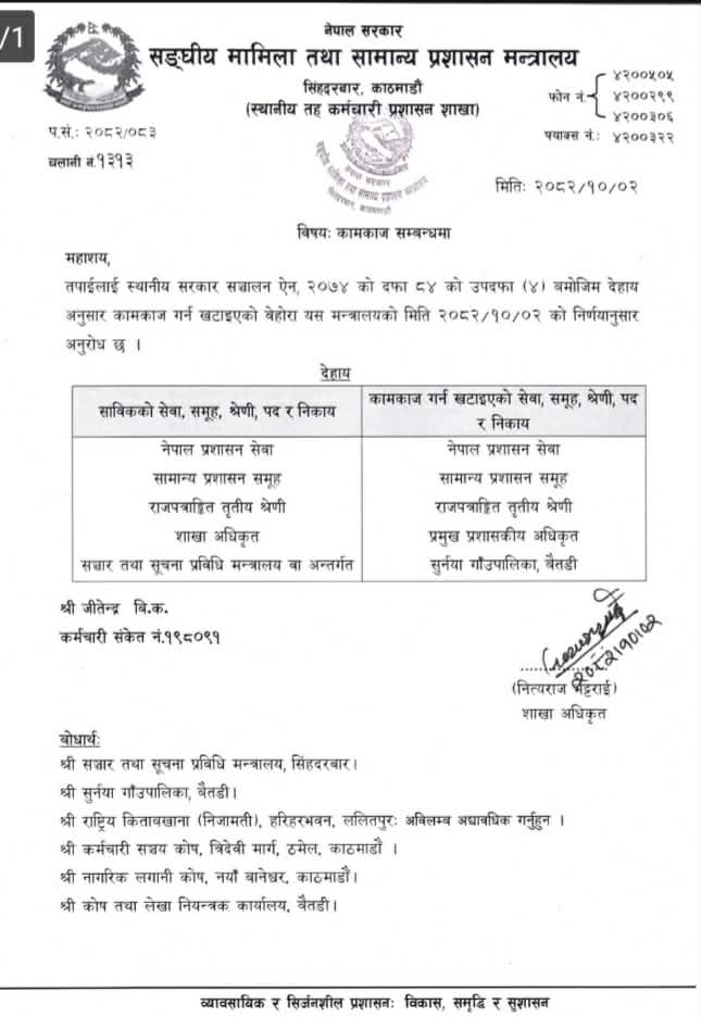 बैतडी सुर्नया-बैतडीको सुर्नया गाउँपालिकाको प्रमुख प्रशासकीय अधिकृतमा जीतेन्द्र विकलाई खटाइएको छ । संघीय मामिला तथा सामान्य प्रशासन मन्त्रालयले सञ्चार तथा सूचना मन्त्रालय अन्तर्गत कार्यरत शाखा अधिकृत विकलाई गाउँपालिकाको प्रमुख प्रशासकीय अधिकृतमा खटाएको हो ।