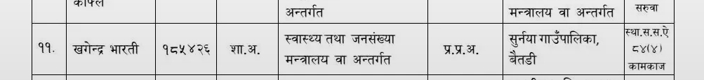 गत पौष ६ गते सङ्घीय मामिला तथा सामान्य प्रशासन मन्त्रालयले शाखा अधिकृत खगेन्द्र भारतीलाई गाउँपालिकाको प्रमुख प्रशासकीय अधिकृतमा सरुवा गरेको थियो । तर भारती गाउँपालिकामा हाजिर नहुँदै जिल्ला निर्वाचन कार्यालय बैतडीमा सरुवा भएको छ । भारती जिल्ला निर्वाचन कार्यालयमा आइसकेका छन् ।