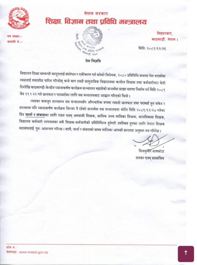 ‘भोलि मिति २०८१–१२–२७ गतेका दिन वार्ता र संवादका लागि राहत एवम् अस्थायी शिक्षक, साविक उच्च माविका शिक्षक, बालविकास शिक्षक, विद्यालय कर्मचारी लगायतका सबै शिक्षक–कर्मचारीको प्रतिनिधित्व हुनेगरी उपस्थित हुनका लागि नेपाल शिक्षक महासंघलाई पुनः आमन्त्रण गरिन्छ। साथै, वार्ता र संवादको समय तालिका आपसी सल्लाहअनुसार तय गरिनेछ,’ विज्ञप्तिमा उल्लेख छ।